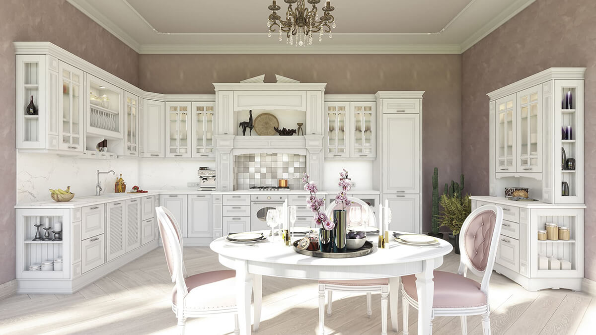 - Симметрия, баланс, выразительность линий: Классика — это стиль, основанный на гармонии. Все элементы кухонного гарнитура логически и визуально уравновешены, линии мягкие, формы — проверенные временем.