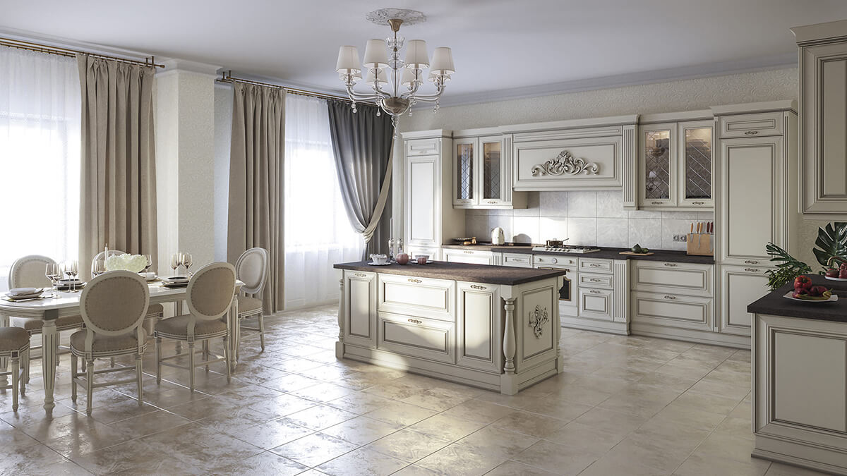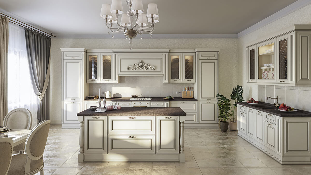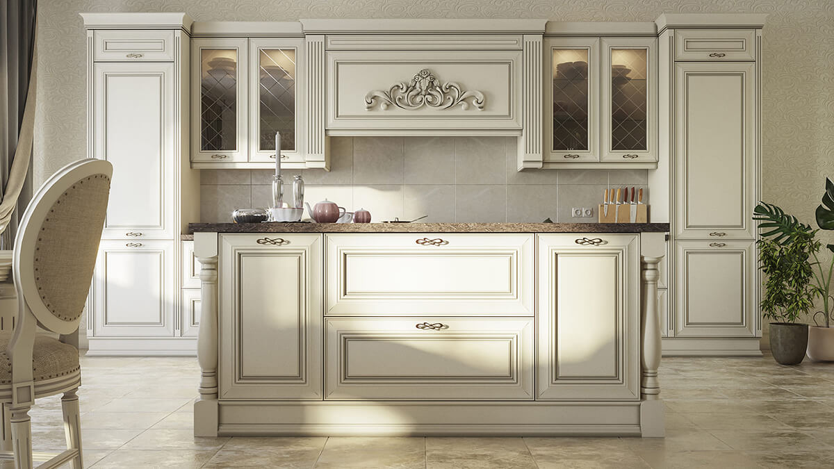 Мебель в классическом стиле никогда не бывает «плоской» или односложной. Она состоит из элементов архитектуры: колонны, пилястры, карнизы, цоколи, капители — всё это помогает визуально структурировать пространство и придаёт кухне образ завершённого, художественного объекта. Часто применяются декоративные элементы ручной работы, филёнки, массивные столешницы, фронтоны над вытяжками — каждый из них имеет свою роль в композиции.