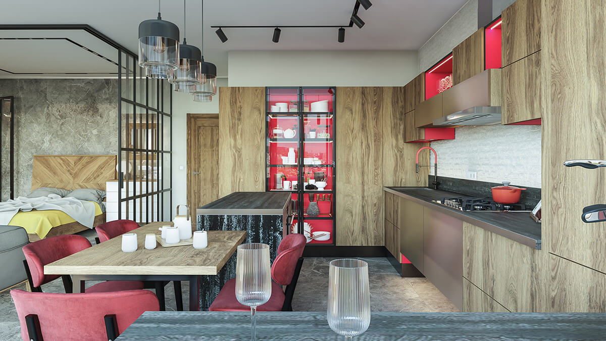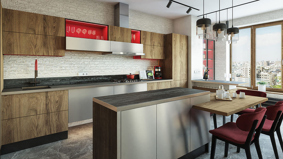 - Натуральные материалы. Дерево, камень, металл, стекло — основные элементы отделки. Эти материалы не только экологичны, но и придают кухне тёплый, уютный облик.